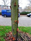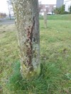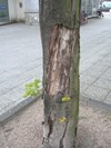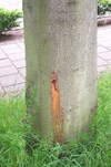 Ontwikkeling kastanjebloedingsziekte Maar het toch wel belangrijkste doel van de inventarisaties is het waarborgen van de publieke veiligheid. Want hoe ontwikkelt de ziekte zich en wanneer is de zieke boom nu onveilig? De aantastingen van het hout zijn moeilijk zichtbaar. Bij het verwijderen van aangetaste bast blijkt de achterliggende houtstructuur soms vérgaand bros. Het gebeurt ook regelmatig dat er takken uit de kastanje breken of dat de boom in zijn geheel afbreekt. Welk moment bepaalt nu het besluit de boom te kappen? Een handvat hiervoor kan zijn de mate van baststerfte maar bijvoorbeeld ook de aanwezigheid van secundaire aantasters. Wanneer in de boom een secundaire aantasting aanwezig is, gaat de breukvastheid van de boom in rap tempo achteruit. Zie ook het artikel van Jan Hilbert (Copijn Boomspecialisten) in Tuin en Landschap (19 2013).